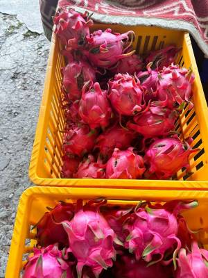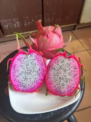 果園採「雙色紅龍果」品種,果肉飽滿、水分豐富,風味濃郁,是許多老顧客每年必定預約的夏季好味道。 每年七月起開放訂購並陸續出貨,由簡二哥負責農務與採收,簡小妹則負責接單與出貨聯繫,讓每一顆送到顧客手中的果實都保持最新鮮的品質。