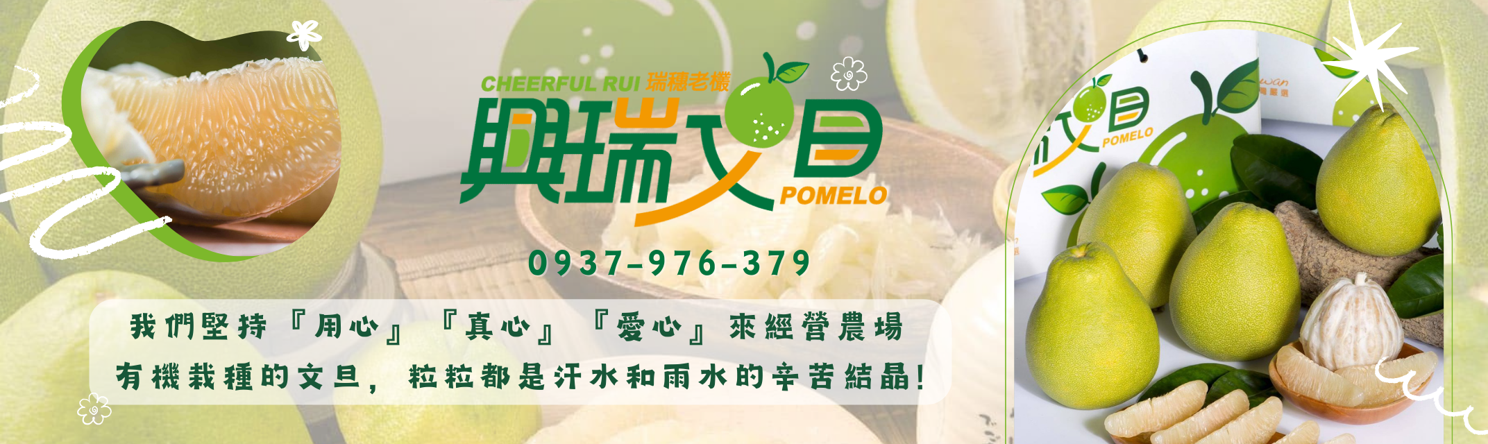 興瑞有機農場以三代共同回憶為基礎,堅持有機農法栽種,展現出「食在安心」、「送禮放心」、「對興瑞有信心」的經營理念。全面採用有機施作,並通過『慈心機構有機驗證 - 合格』,使用自製牛奶液態肥、天然堆肥、自製天然酵素、草生栽培等方式來呵護每顆文旦,讓顧客安心享用「柚香柚甜」的文旦。營業項目包括專售有機文旦和食用木薯,特色在於有機草生栽培、自製天然酵素、清新柚香、無毒表皮紋路。營業時間為星期一至星期五上午10:00至下午16:00。【LINE ID:@jsx7976p 訂購專線:0937-976-379】。