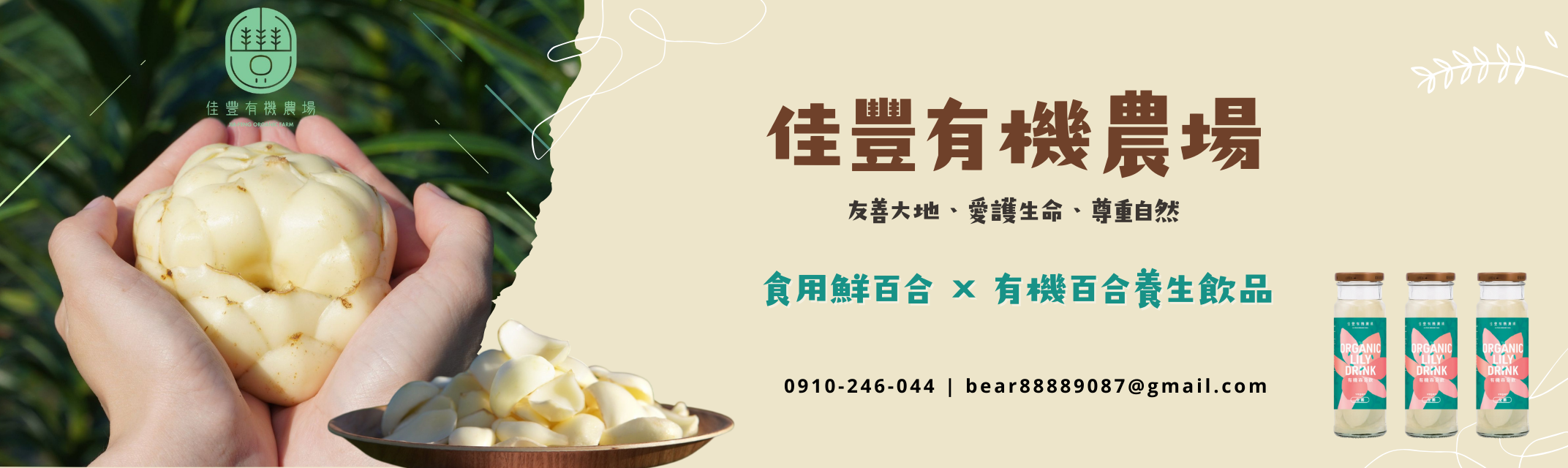 佳豐有機農場是一家位於花蓮縣壽豐鄉的有機農場,成立於1999年,專注於有機食用百合的栽培與培育超過25年。我們堅持全程有機栽種,不使用化學農藥與除草劑,讓每一株百合都來自最純淨的土地。農場創辦人李家豐大哥更是台灣第一位成功種植並通過有機驗證的食用百合農民,並榮獲「2019全國十大農」的肯定。我們提供有機鮮百合、有機百合片、有機百合養生飲品和有機百合禮盒組等多樣產品,期望透過無毒、安心的農產品,守護消費者的健康,也守護台灣的土地與下一代。歡迎您來到佳豐有機農場,一同品嘗這份來自花蓮的養生美味與自然心意。
